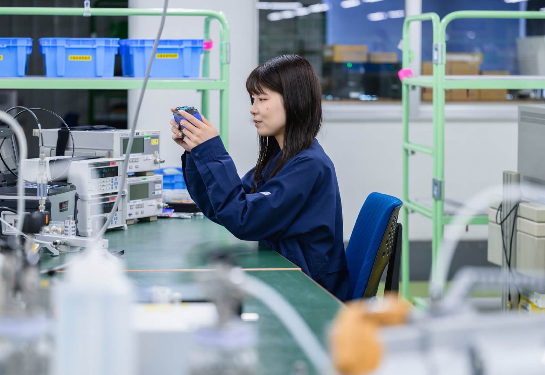 私はいま東京技術センターに所属し、お客さまに提供する測定器の「校正」を主に担っています。校正とは、測定器の精度を確認する作業のこと。もし測定器の精度が誤っていれば、お客さまは正確な測定ができないため、きわめて重要な作業です。この校正業務を実際に手がける技術スタッフをマネジメントして計画通りに作業を進めていくとともに、お客さまからの「すぐに使いたい」というご依頼に対応し、営業部門との調整や納期等の確認を行うことが私の役割です。校正現場の技術スタッフをマネジメントする私自身も、測定器の校正について熟知しておかなければならず、絶えず勉強しながら社内資格の「技能レベル」の取得に励んでいます。私は大学院の研究で測定器を扱った経験はありますが、電気系や機械系は得意ではなかったので、最初は不安でした。しかし、原理や構造を学んで理解できるようになると、「測定器って面白い」と興味がどんどん湧いてきました。お客さまの開発現場を見学させていただく機会もあり、提供した測定器が身近な家電製品などの評価に使われている様子を目の当たりにすると、自分の仕事が社会に貢献していることを実感します。